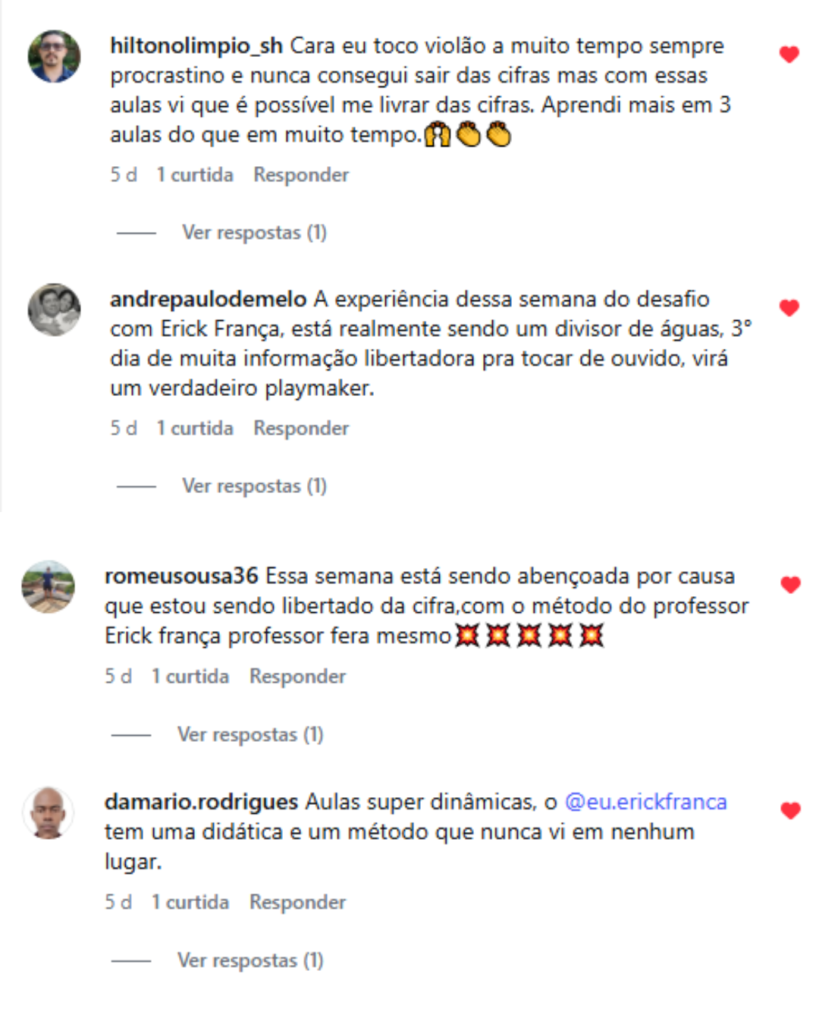 Você terá 7 dias de garantia, podendo testar o conteúdo sem riscos e receber seu dinheiro de volta se não gostar. Além disso, contará com acompanhamento completo, um grupo de avisos exclusivo, 5 aulas ao vivo e tudo o que o maior Desafio para músicos do Brasil pode te oferecer.
